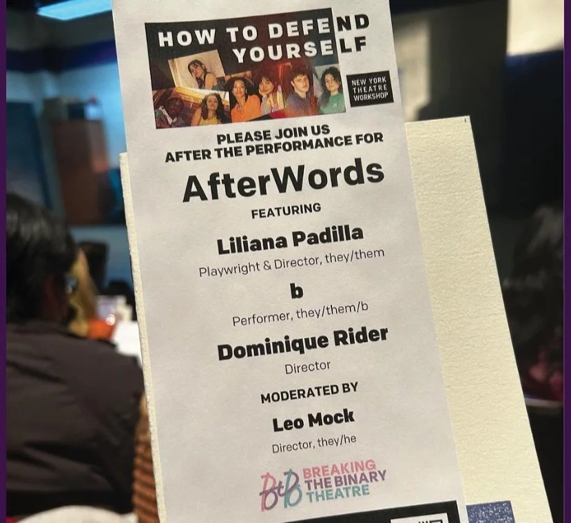 On Thursday, March 9, 2023, we partnered with Admin Ally New York Theatre Workshop once again to celebrate BTB Artist Liliana Padilla’s HOW TO DEFEND YOURSELF. After providing free tickets for over 30 BTB artists to see the production, Liliana (they/them) joined fellow BTB Artists b (they/them) and Dominique Rider for a post-performance talkback, moderated by Leo Mock (they/he).