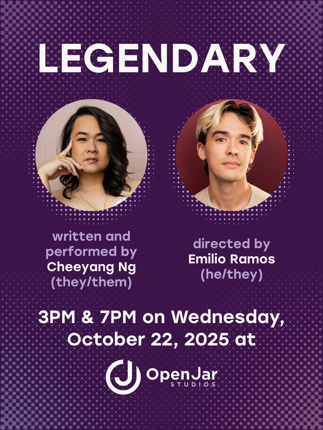 Legendary is a solo ritual-musical that follows a queer Asian immigrant in the U.S. as they wrestle with inherited legacies and imagine new ones. Blending Chinese mythology, circle singing, and audience call-and-response, the Narrator transforms their search for identity and belonging into the creation of a brand-new myth: an act of collective healing, joy, and defiance.